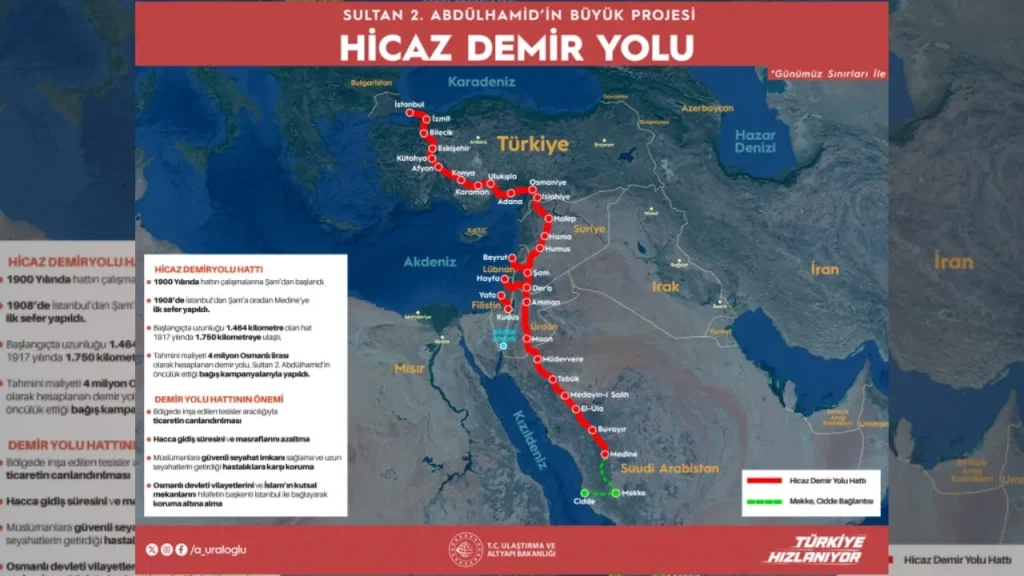 Türkiye, Suriye ve Ürdün, tarihi Hicaz Demiryolu Hattı’nı yeniden hayata geçirmek için ilk adımı attı. Ulaştırma ve Altyapı Bakanı Abdulkadir Uraloğlu, Türkiye’nin desteğiyle Suriye’de eksik kalan 30 kilometrelik hattın üstyapısının tamamlanacağını açıkladı.